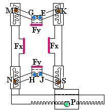 For this right-side of the Hole-N-Ator, assumptions were also made. Again, both the top and the bottom muscle blades are considered to have equal and opposite forces (Fy), thereby allowing the two-force members called the bar for the muscle blades (member GM, member EK, member HN, and member JS) to have equal forces applied by them EK. For the ease of notation, GM is used in this case (remember GM=EK, from above). The reactions at the crank mechanism (Px and Py) are drawn in this free-body diagram, but are drawn in equal and opposite magnitudes in relation to the free-body diagram for the member MNP - left side.
